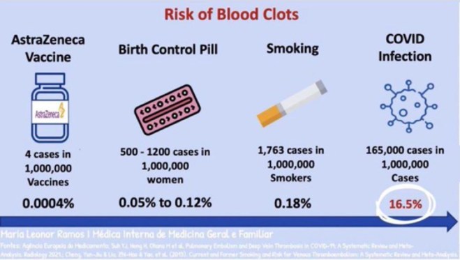 Sobran argumentos y palabras, no hay comparación a la posibilidad de trombos de medicamentos como la «píldora» comparado con esta vacuna o con una acción tal simple como fumar. Pero aún es peor el riesgo a Trombos que causa una infección por COVID, nada menos que el 16,5% de los pacientes sufren trombos, mientras que el riesgo a trombos con esta vacuna es 0,0004%.